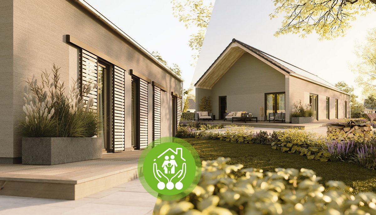 Ein weiteres herausragendes Merkmal des Bungalow 100 Novo ist die nachhaltige Bauweise. Town & Country Haus setzt auf eine umweltfreundliche Energiegewinnung durch Indach-Photovoltaikanlagen und somit eine erhebliche Reduzierung der Energiekosten. Zudem schaffen große Fenster lichtdurchflutete Räume und eine angenehme Wohnatmosphäre. Auch die Fassade des Bungalow 100 Novo ist modern gestaltet. Elemente wie Besenzugputz und gefilzte Kassetten neben den Fenstern sorgen für eine besondere Ästhetik. Schiebeläden dienen nicht nur als Sicht- und Sonnenschutz, sondern tragen auch zur Wärmeregulierung bei.